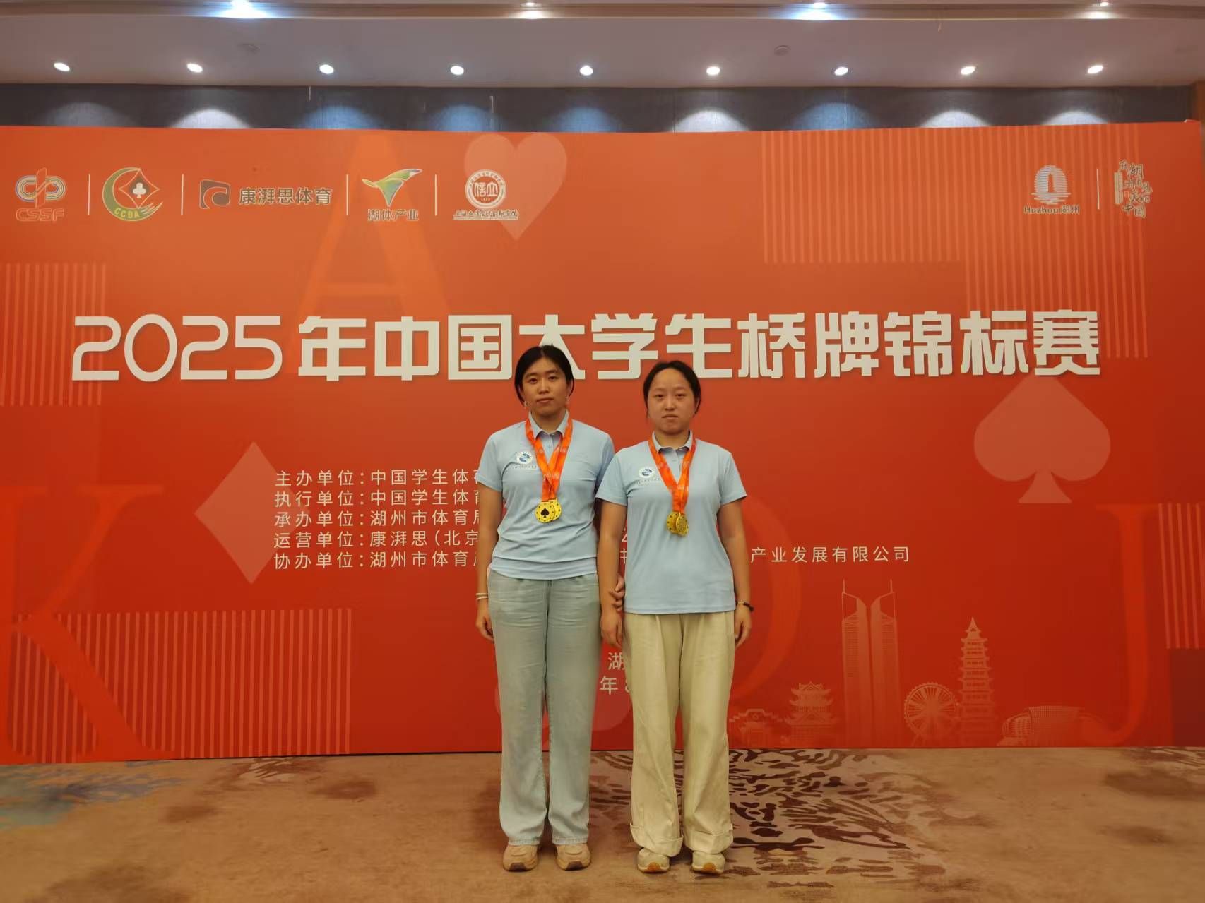 近日,瑶湖学院21级学生徐茹萍、朱灿在 2025 年中国大学生桥牌锦标赛中双双获奖,用实力展现了瑶院学子的卓越风采。徐茹萍与其队友,斩获女子团队赛、女子双人赛两项全国冠军,是我校桥牌队创队十三年来的最高荣誉;朱灿同学荣获公开团体赛第八名。